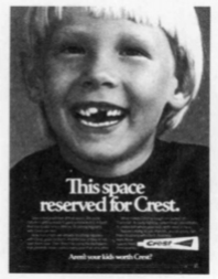 科学广告之父克劳德·霍普金斯在《科学的广告》中说,,,,,,,,广告要展示优秀的一面,,,,,,,,而非糟糕的一面,,,,,,,,例如牙膏广告就要展示整齐漂亮的牙齿而不是蛀牙或缺颗牙。。。。。。大卫·奥格威觉得很赞,,,,,,,,说每个文案都要把这本书读7遍才能上岗,,,,,,,,然后我们看到了各种闪瞎人眼的牙膏广告,,,,,,,,于是这个“缺颗牙” 的佳洁士广告就成为了经典。。。。。。